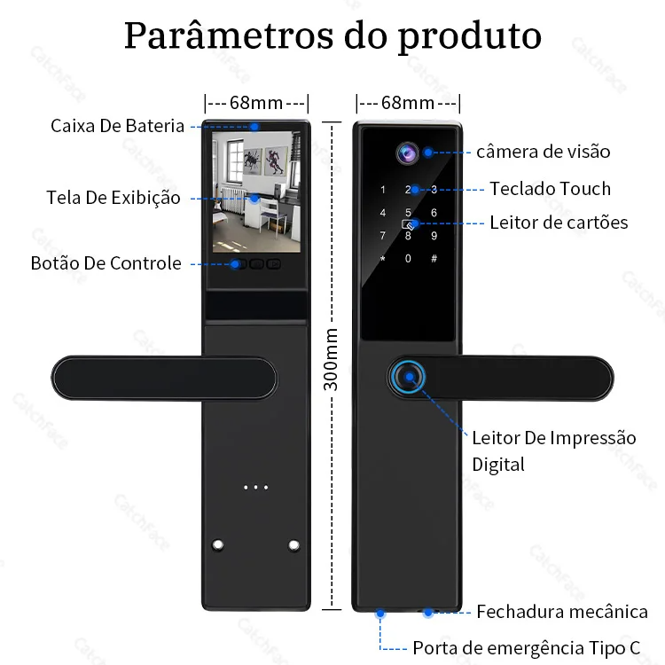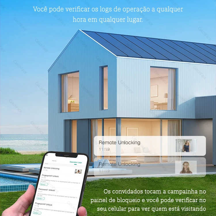 6 formas de desbloqueio: aplicativo Wi-Fi, impressão digital, senha numérica, cartão RFID, chave mecânica e comando remoto.