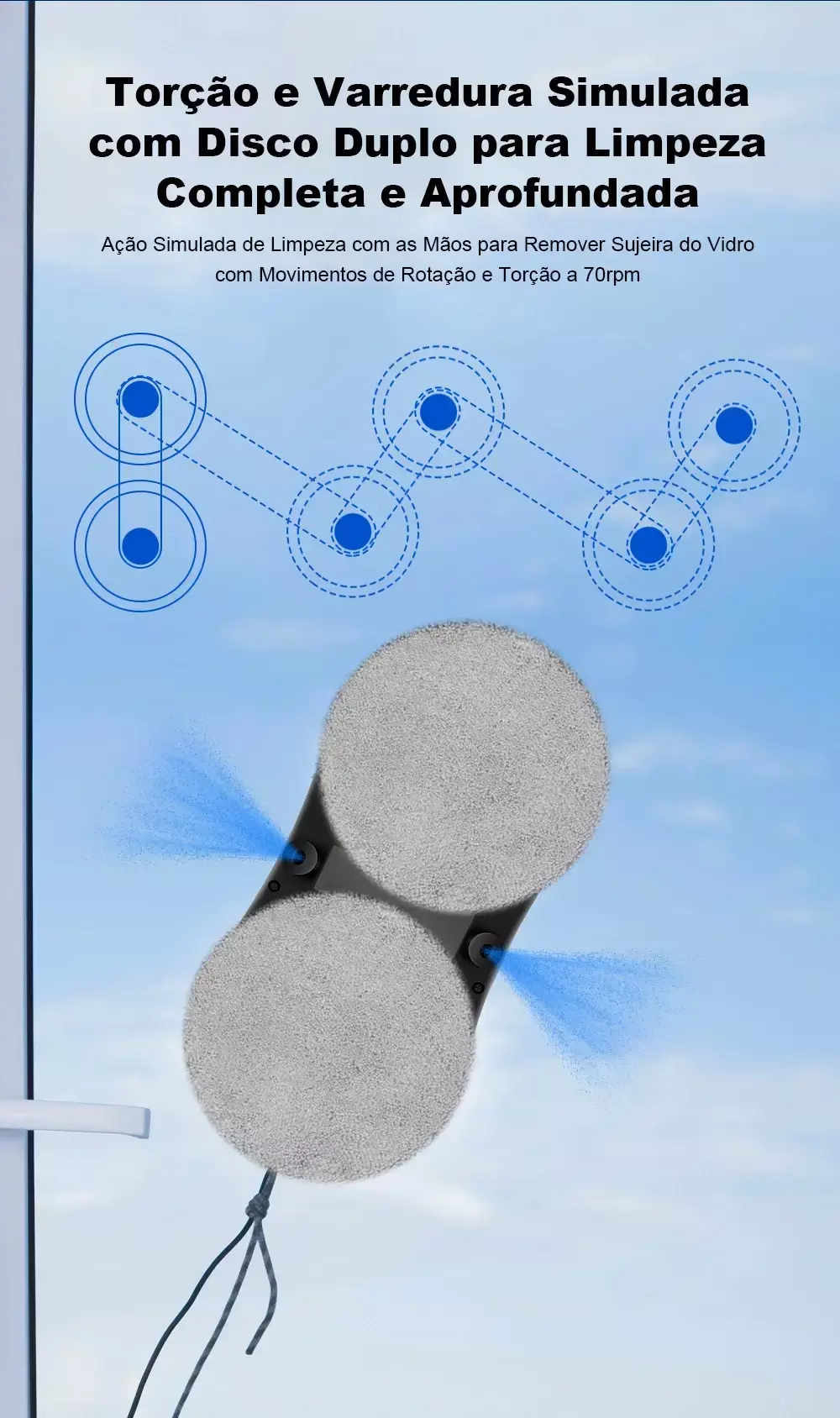 Diga adeus ao esforço de limpar janelas altas e difíceis de alcançar! Esse robô de limpeza de vidros com spray automático de dupla face garante brilho impecável em vidros internos e externos, trazendo praticidade, segurança e tecnologia para o seu dia a dia. Com sensores inteligentes de borda e sistema de segurança antifalhas, ele é perfeito para quem busca eficiência e tranquilidade ao manter a casa sempre limpa.